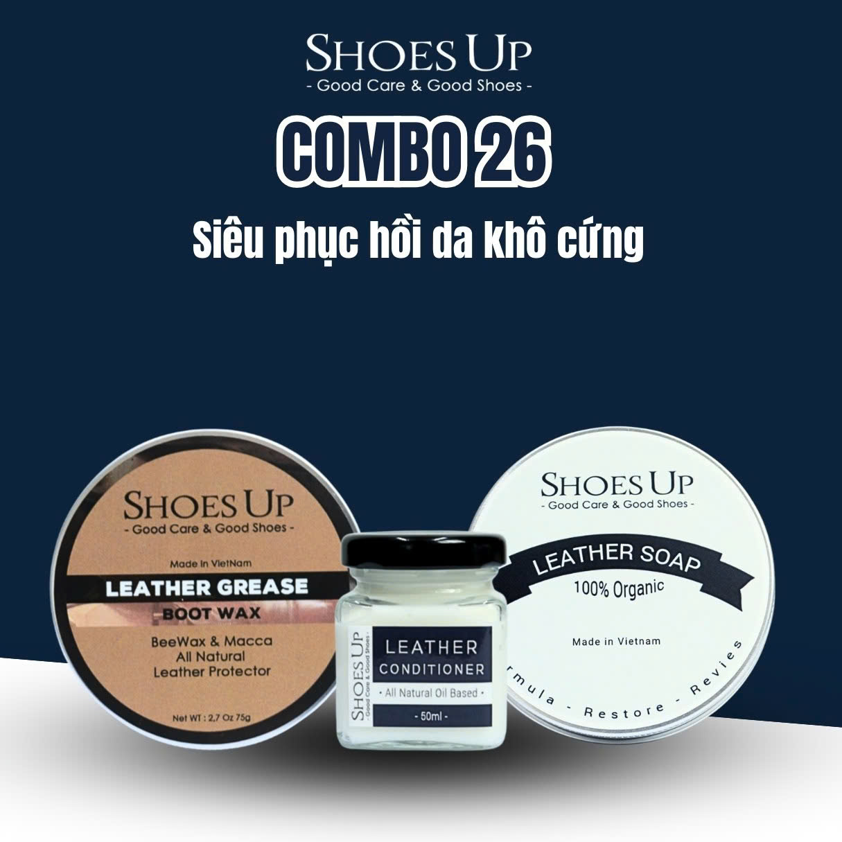 Combo Shoes Up 26: Phục hồi giày da khô cứng - Làm sạch, mềm & dưỡng ẩm chuyên sâu cho giày da