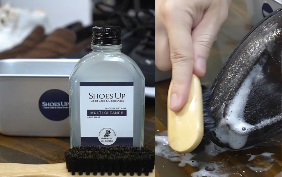 - Dùng Shoes Up MultiCleaner pha loãng. Dùng bàn chải chà nhẹ, làm sạch toàn bộ bề mặt.