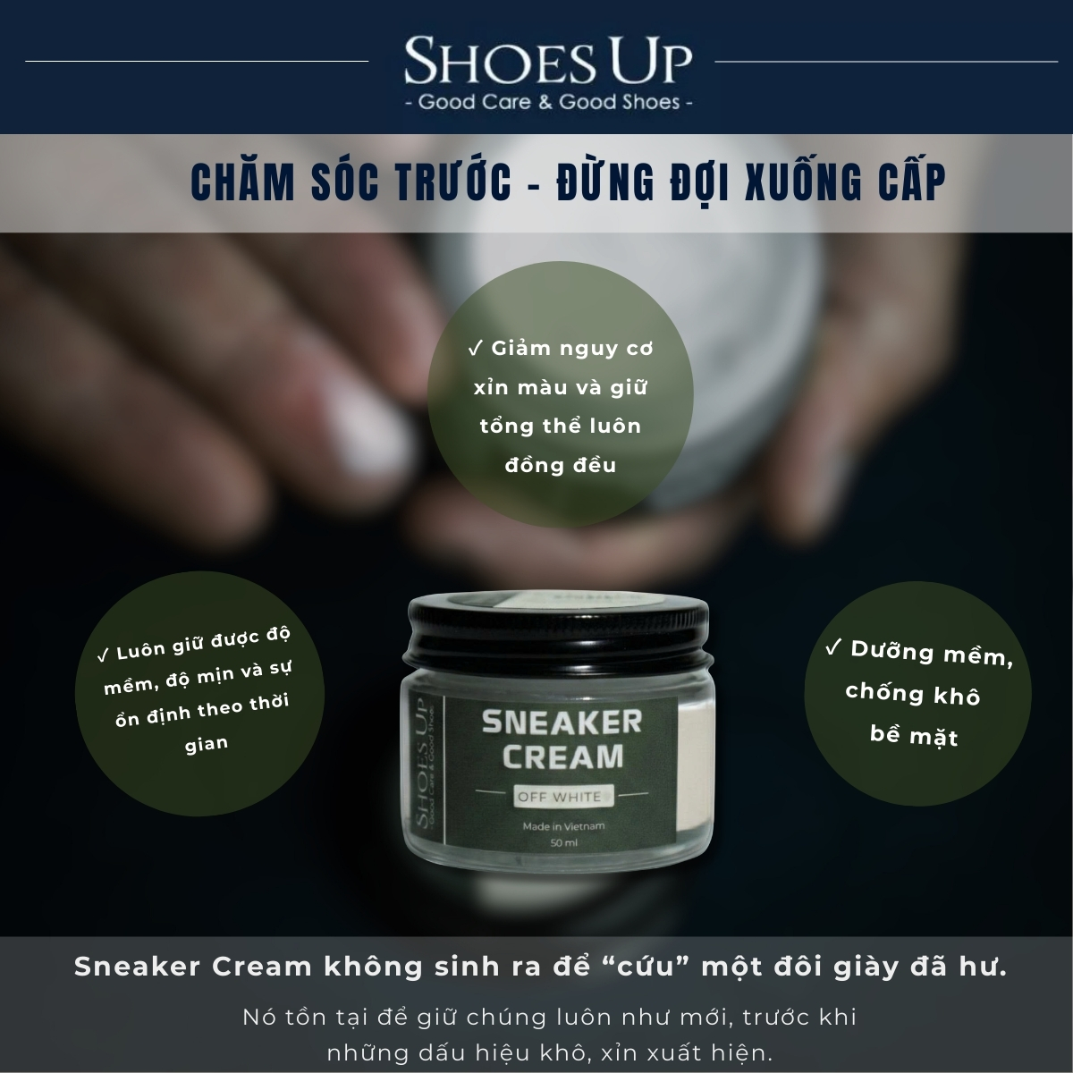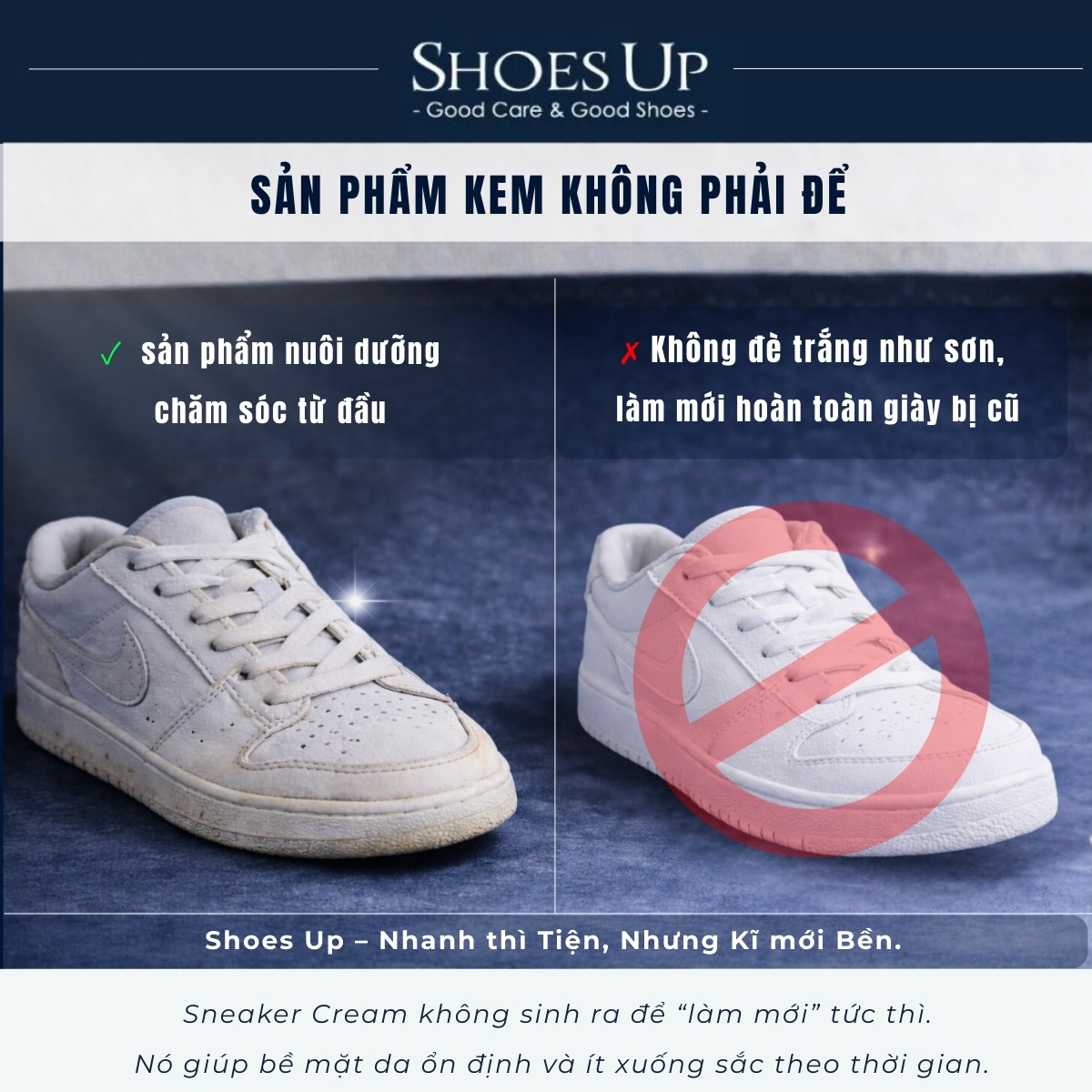 Sneaker Cream Shoes Up không được tạo ra để xử lý khi giày đã hỏng. Nó được phát triển để sử dụng trước khi những dấu hiệu đó xuất hiện — như một bước dưỡng định kỳ giúp bề mặt luôn giữ được độ mềm, độ mịn và sự ổn định theo thời gian.